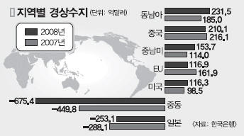최대 교역흑자국의 자리바꿈도 일어났다. 중국을 제치고 동남아가 1위로 올라섰다. 중국에서 벌어들은 경상수지 흑자액이 전년보다 6억달러 줄면서 210억 1000만달러에 그친 반면 동남아 흑자액은 46억 5000만달러 늘어난 231억 5000만달러로 껑충 뛰었다. 동남아 흑자액이 늘어난 것은 석유·철강제품 등의 수출 호조로 상품수지가 좋아진 덕분이다.