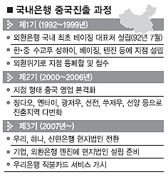 수교 한 달 전인 1992년 7월 외환은행이 베이징 대표처를 개설하면서 시작된 국내 은행들의 중국 진출은 올해로 17년째를 맞았다. 지난달 말 현재 국내 은행들은 중국내에 분행(지점) 30곳, 지행(출장소) 15곳, 사무소 5곳을 운영하고 있다. 지난해부터 우리·하나·신한은행이 잇따라 현지법인화에 성공했고, 기업은행은 이달 말 외국계 은행으로는 최초로 톈진(天津)에 현지법인을 설립한다. 외환은행도 톈진에 본점을 두는 현지법인 인가 신청을 했다. 국내 은행들의 자산규모는 지난해 말 기준으로 약 85억달러로 외국계 은행 전체의 4.1%를 차지하고 있다.