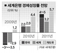 한편 WB는 올해 세계 경제성장률은 -2.9%, 내년에는 2%, 2011년에는 3.2%를 기록할 것으로 예측했다. 올해 성장률은 지난 3월 발표한 -1.7%에 비해 낮은 수치다. 개도국의 성장률은 올해 1.2%, 내년 4.4%, 2011년 5.7%로 세계 경제 성장률을 크게 웃돌 것으로 예측됐다. 한스 티머 WB 경제전망 담당은 “내년에는 중국 등 개도국 성장이 세계 경제 성장률 회복에 60%의 영향을 미칠 것”이라고 말했다.