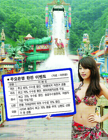 은행들이 실시하고 있는 여름 맞이 환전 이벤트도 이용해 볼 만하다. 대부분 ‘환전우대’란 이름으로 수수료를 깎아주고 있다. 할인율은 조건에 따라 30~70%까지 천차만별이다. 여행자수표는 7월이 되기 전에 구입하는 것이 좋다. 독점 사업자인 아멕스사가 다음달부터 달러 표시 여행자수표에 대해 발행금액의 0.55%를 수수료로 물리기로 했기 때문이다.