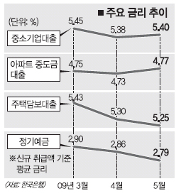 하지만 일시적 요인으로 보기에는 심상찮은 대목이 눈에 띈다. 우선 중소기업 대출 금리가 연 5.40%로 4월보다 0.02%포인트 올랐다.