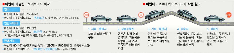 다음달에는 우리나라도 하이브리드차 생산 국가 명단에 이름을 올린다. 국내 첫 하이브리드 상용차인 현대자동차 ‘아반떼 LPI 하이브리드’가 출시된다. 일본 업체와의 경쟁을 피하기 위해 가솔린 연료를 쓰지 않아 ‘내수 방어용’이란 평가도 나오지만, 세계 최초의 천연액화가스(LPG) 하이브리드 차량 개발이란 점에서 의미가 있다. 현대차는 다음달 8일 ‘아반떼 LPI 하이브리드’를 내놓는다. 이어 다음달 말에는 기아자동차가 ‘포르테 LPI하이브리드’를 선보인다.