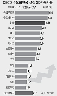 29일 기획재정부 등에 따르면 OECD는 중장기 세계경제 전망 보고서에서 한국의 실질 국내총생산(GDP) 증가율이 2011~2017년 평균 4.9%를 기록해 룩셈부르크(5.5%), 슬로바키아(5.3%)에 이어 3위를 기록할 것으로 예측했다.