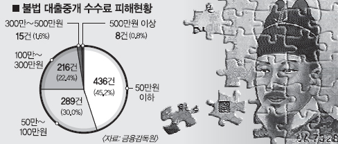 29일 금감원에 따르면 지난 1월부터 불법 대출중개수수료 피해신고 코너를 마련한 뒤 5월말까지 모두 964건, 8억 7800만원 규모의 신고가 접수됐다. 월별로는 1월 119건에서 2월 267건, 3월 196건, 4월 211건, 5월 171건을 기록했다. 이 가운데 802건, 6억 4900만원은 중개업체들에 중개수수료를 반환하도록 했고 37건은 반환 절차가 진행 중이다. 101건은 중개업체가 반환을 거부해 수사기관에 통보했다.