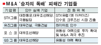 ‘승자의 독배’를 뒤로하고 ‘패자의 성찬’을 맛본 대표적 기업은 STX그룹. STX는 지난해 대한통운, 대우조선해양 등 인수전에서 잇따라 쓴 잔을 마셨다. 그것도 최고 가격을 제시하고도 물(?)을 먹었다.