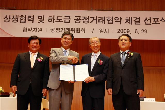 대우건설은 이 협약에 따라 공정한 하도급 거래를 위한 3대 가이드라인을 마련해 시행하기로 했다. 사진은 왼쪽부터 이규준 대한전문건설협회 서울시회 회장, 서종욱 대우건설 사장, 권오석 성보개발 대표, 박상용 공정거래위원회 사무처장.