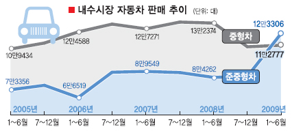 반면 올 상반기 중형차(2000㏄이상급)는 지난해 같은 기간에 비해 판매가 14.8%나 감소했다. 현대차 쏘나타·기아차 로체·GM대우 토스카 등 중형차는 11만 2777대(택시포함) 팔리는 데 그쳤다.