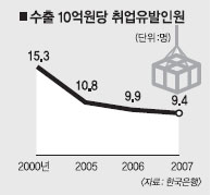 취업유발계수도 2007년에 13.9명으로 2006년 14.3명과 비교하면 하향 곡선을 타고 있다. 취업유발계수는 10억원어치를 생산할 때 전 산업에서 직·간접적으로 유발되는 취업자 수를 말한다. 수출 10억원당 취업유발 인원도 9.4명을 기록했다. 2000년 15.3명, 2005년 10.8명, 2006년 9.9명과 비교해 빠르게 줄고 있다. 산업별 취업유발계수는 농림어업이 46.8명으로 가장 높고 이어 서비스업 18.1명, 건설업 16.8명, 광업 10.3명, 제조업 9.2명, 전력·가스·수도 3.5명 등의 순이었다.