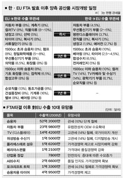 한·EU FTA는 우리나라에 있어 최초로 발효되는 거대 경제권과의 ‘무역 고속도로’가 될 것이 확실시된다는 것이 통상 당국의 시각이다. 2007년 6월 타결된 한·미 FTA가 2년이 지나도록 양국 국회 비준을 통과하지 못하고 있는 가운데 당장 진전 기미도 안 보이기 때문이다. 정부 관계자는 13일 “미국은 경제위기에 더해 건강보험 개혁 등 내부 현안이 많아 FTA 등 통상 이슈는 처리 순위가 한참 뒤로 밀려 있다.”면서 “EU와 FTA 타결이 미국에 자극제가 되기는 하겠지만 발효 시점은 더 늦어질 공산이 크다.”고 말했다.