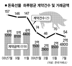 17일 한국거래소에 따르면 올 들어 이달 16일까지 돼지고기 선물시장에서 하루 평균 거래량은 56건이다. 이는 지난해 하루 평균 거래량 146건의 3분의1 수준에 불과하다. 지난해 7월21일 돼지고기 선물시장 개장 당시 예측한 하루 평균 거래량 1000건에도 턱없이 못 미친다. 하루 평균 거래대금 역시 지난해 5억 9000만원에서 올해 2억 5000만원으로 ‘반토막’ 난 상황이다.