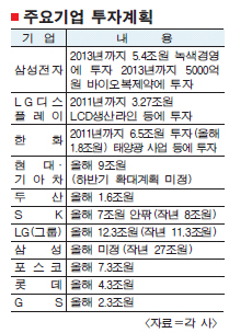 지난해 8조원을 투자한 SK그룹은 올해는 연구개발 투자계획(1조 3000억원)만 발표했다. 연구·개발 투자는 지난해(1조 1000억원)보다 늘어났지만 설비투자계획은 확정하지 못했다. SK는 올 상반기 3조원 정도를 투자했는데 하반기에는 이보다 약간 늘어날 것으로 보인다.