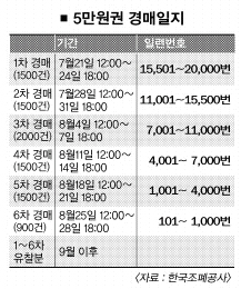 2007년 1만원권이나 1000원권 경매 때는 각각 10장 한 묶음으로 판매되지만 5만원권은 101~1000번은 1장 단위, 1001~1만 1000번은 2장 묶음, 1만 1001~2만번은 3장 묶음으로 판매된다. 액면가가 높아 입찰 참여자의 부담을 줄이기 위한 조치다. 경매 시작가는 각각 5만 1000원, 10만 2000원, 15만 3000원이다.