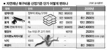 농림수산식품부는 이 같은 내용을 담은 ‘2009년도 농어업재난 복구비용 산정기준단가’를 고시하고 시행에 들어간다고 20일 밝혔다. 이 기준은 이번 달 장맛비 피해를 본 농어가 지원부터 새롭게 적용된다.
