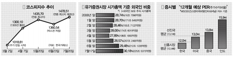 주춤하던 외국인 매수세도 지난달부터 회복 조짐을 보이고 있다. 지난 17일 현재 유가증권시장에서 외국인들의 시가총액 비중은 연초 대비 1.44%포인트 높아진 30.18%이다.