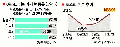 시장정보 업체인 부동산114에 따르면 금융위기 전인 지난해 8월 말 부동산 가격을 100으로 봤을 때 지난 17일 강남 3구와 강북의 가격 지수는 각각 97.25, 97.15를 기록했다. 전국 기준으로도 97.23에 이르는 등 부동산 가격은 리먼 사태 이전 수위를 거의 회복했다.저금리, 공급 부족 등으로 집값이 급등했던 2000년대 초와 같은 환경이 마련됐다는 우려도 나온다.