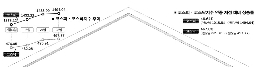 코스피지수가 ‘깜짝’ 오름세를 나타내는 반면, 코스닥지수는 ‘찔끔’ 상승에 그치고 있다. 양 시장 상장기업들의 실적에 대한 온도 차이가 주요 원인으로 꼽힌다. 앞으로도 경기회복 속도와 맞물려 양 지수가 동반 상승보다는 시간차 상승 가능성에 무게가 실리고 있다.22일 유가증권시장에서 코스피지수는 전날보다 5.05포인트(0.34%) 오른 1494.04로 장을 마감했다. 코스닥지수도 1.86포인트(0.38%) 오른 497.77로 거래를 마쳤다. 각각 1500선과 500선 고지에 바짝 다가섰다.