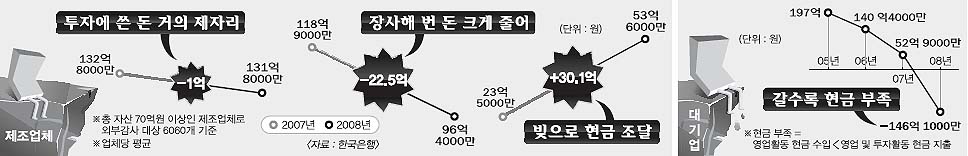 다급해진 대기업들은 은행 대출·회사채 발행·증자 등(재무활동)을 통해 현금을 대거 확보했다. 2006년 37억원에 불과했던 대기업들의 연간 차입금은 2008년 455억원으로 무려 12배 이상 급증했다. 현금 부족분을 메우고도 남을 만큼 넉넉하게 돈을 빌리다 보니 기업들의 기말(회계연도 마지막날) 현금 보유액은 2006년 503억원에서 2008년 700억원으로 오히려 늘었다.