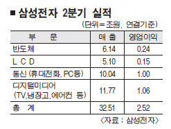 삼성전자는 역시 불황에도 강했다. 지난 6일 공시를 통해 시장에 발표한 것처럼 2·4분기에 깜짝 놀랄 만한 실적을 냈다. 삼성전자는 24일 2분기 연결기준으로 매출 32조 5100억원, 영업이익 2조 5200억원을 거뒀다고 밝혔다. 반도체·액정표시장치(LCD)·통신(휴대전화)·디지털미디어(TV) 등 4개 부문이 모두 약진했다.