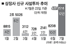 그러나 5월 2141억원, 6월 8208억원에 이어 이달에는 23일 현재 4조 3518억원으로 증가세가 뚜렷하다. 지난해 월평균 신규 시설투자 규모 2조 9903억원을 뛰어넘은 것은 올 들어 이달이 처음이다. 유가증권시장에서 올 들어 가장 큰 신규 시설투자 계획을 발표한 기업은 LG디스플레이로, 액정표시장치(LCD) 생산시설 확충에 3조 8471억원을 투입한다. 이어 대한항공 2조 2831억원, 한국가스공사 7386억원, LG화학 4300억원, LG텔레콤 3380억원 등의 순이다. 코스닥시장에서는 에이스디지텍이 469억원으로 가장 많다. CJ프레시웨이(211억원), 대림제지(132억원), 서울마린(116억원), 에이스안테나(106억원) 등이 뒤를 이었다.