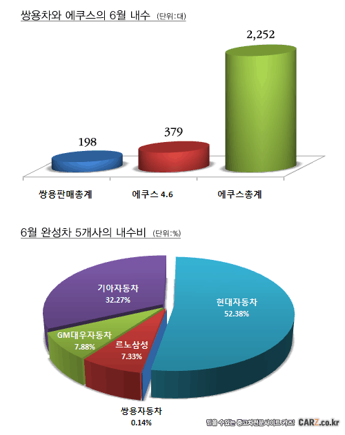 198대 판매는 같은 기간 현대자동차의 에쿠스 모델 판매량보다 못할뿐 아니라,1억원이 넘는 에쿠스 4.6 등급 판매고보다 밑돈 것이다.에쿠스 4.6 등급은 지난달 379대가 판매돼 쌍용차 전체 판매고의 두 배 가까이에 이르렀다.