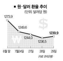 사상 최대 흑자 소식에도 이날 원·달러 환율이 오히려 오른 것은 이같은 맥락에서다. 원·달러 환율은 달러당 3.4원 오른 1239.9원을 기록했다. 올해 저점(6월3일 1233.2원)이 쉽게 깨지지 않고 있다. 장중 한때 1229원까지 내려가기도 했으나 이내 상승, 1230~1250원 사이에서 지루한 움직임을 이어가고 있다.