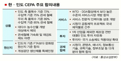 ■ 韓·인도 CEPA 배경과 의미7일 정식 서명하는 한국과 인도의 포괄적 경제동반자 협정(CEPA)은 우리나라가 브릭스(BRICs·브라질 러시아 인도 중국) 국가와 처음으로 맺는 자유무역협정(FTA)이다. 교역과 투자 등에서 잠재력이 큰 신흥 거대경제권에 장기적 기반을 마련, 중국 일본 등 경쟁국에 비해 경쟁력을 높이는 제도적 틀을 확보한 셈이다.