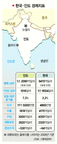 인도는 세계에서 두번째로 많은 11억 5000만명의 인구에 구매력 평가 기준 세계 4위의 국내총생산(GDP)을 올리고 있는 신흥 거대 시장이다. 세계 경제가 경제위기의 몸살을 앓고 있는 올해에도 6.5%의 성장률을 기록할 것으로 예상되는 등 중국과 더불어 꺼지지 않는 세계경제의 원동력이다.