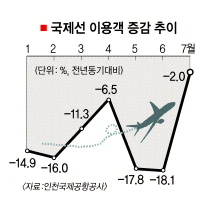 노선별로는 미주노선과 일본 노선이 각각 1.4%, 2.0%가 늘어 항공수요를 견인했다. 미주노선은 7월 한달 동안 38만여명이 이용해 지난해 8월 이후 이용객수가 최고치를 기록했다. 미주, 일본 노선 여객수요가 늘어난 이유는 환승객이 늘어났기 때문이다. 대한항공의 경우 일본 니가타~인천의 운항스케줄을 30분 앞당기자 인천을 통해 미국, 유럽, 호주 등으로 환승하는 승객이 90%나 늘어났다.