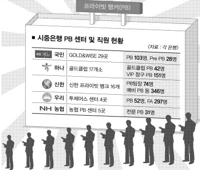 지난 4월 PB사업단을 WM(weal th management) 그룹으로 재편한 신한은행은 최근 전문 PB 8명을 중심으로 도제식 PB 교육제도를 마련했다. 8명의 교육전문 PB가 전국 지점의 VIP고객 담당자의 담임교사가 되는 방식이다. 전담 교사들은 지역을 돌며 기존의 VIP창구 직원들을 만나고 교육하게 된다. 기존 창구직원을 업그레이드해 ‘1지점 1PB’를 만들겠다는 목표다.