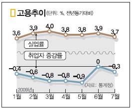 공공행정 부문 취업자는 정부의 ‘희망근로 프로젝트’ 등에 힘입어 6월 26만 8000명, 7월 31만 9000명의 증가세를 보였다. 하지만 고용의 핵심인 제조업과 도·소매, 음식·숙박업 등에서는 부진이 지속됐다. 지난달 제조업에서는 취업자가 지난해 같은 달보다 17만 3000명, 도·소매 및 음식숙박업에서는 같은 기간 16만 5000명 감소했다.
