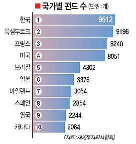 우리나라가 펀드 수로는 세계 1위지만, 순자산 규모에서는 세계 평균에 훨씬 못 미치는 것으로 나타났다.