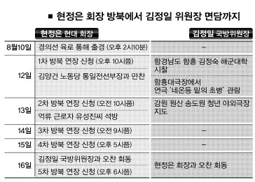 현 회장은 지난 10일 방북 이후 쉽게 성사될 것으로 알려졌던 것과 달리 김 위원장 면담이 미뤄지면서 면담이 물 건너 간 것 아니냐는 비관적인 전망도 대두됐다. 하지만 그는 체류기간을 다섯 차례나 연장하는 집념 끝에 면담을 성사시켰다.