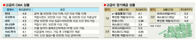 최근 지급결제서비스 시행에 맞춰 증권사들이 잇따라 고금리 종합자산관리계좌(CMA) 상품을 내놓고 있다. 은행들은 덤으로 금리를 더 얹어주는 특판 상품으로 맞선다. 고객들 처지에서는 고르는 재미가 커졌다.