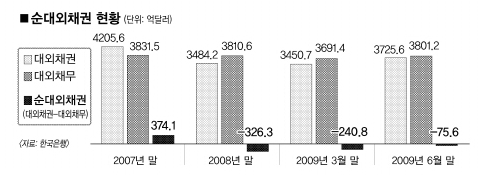한국은행이 19일 발표한 ‘2009년 6월 말 국제투자대조표(잠정) 분석’에 따르면 우리나라의 순대외채무 잔액(대외채무-대외채권)은 75억 6000만달러로 3월 말 240억 8000만달러에 비해 165억 2000만 달러나 줄었다. 여전히 가계부 상엔 빚이 채권보다 75억 6000만달러 많지만 차이(채무-채권)가 줄어드는 속도가 눈에 띄게 빨라졌다는 것이 한은의 설명이다. 우리나라는 2000년 3월 외환위기 극복 과정에서 사상 처음 순채무국이 됐다. 이후 2006년 3월 말엔 순대외채권 규모가 1303억 2000만달러까지 늘어났지만, 지난해 9월 글로벌 금융 위기를 겪으면서 순대외채무가 326억달러까지 늘어 9개월째 순채무국으로 머무르고 있다. 한은 관계자는 “최근 경상수지 흑자와 외환보유액 증가, 미국 연방준비제도이사회(FRB) 통화스와프 자금 상환 등이 순대외채무가 빠르게 줄어드는 이유”라고 설명했다.