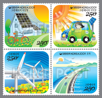그린에너지 특별우표는 ▲태양의 열에너지를 이용해 난방·급탕 등에 사용하는 태양열과 ▲태양전지를 이용해 태양의 빛에너지를 전기로 변환시키는 태양광 발전 ▲풍차를 이용해 바람에너지를 변환시켜 전기를 생산하는 풍력발전 ▲ 바닷물을 이용해 발전기를 돌리는 조력발전을 담았다.