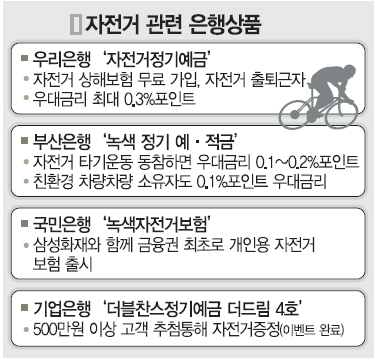 ‘자전거 타고 은행에 오는 분은 이자를 더 드립니다.’ 은행들이 자전거 관련 상품을 앞다투어 내놓는 등 자전거 보급에 적극적이다. 정부가 추진 중인 녹색성장에 일조하겠다는 의지를 보여주는 셈이다.
