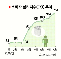 취업기회전망 CSI도 7년 만에 100을 넘어섰다. 7월 91에서 8월 104로 13포인트 뛰었다. 지금의 생활형편이나 수입전망, 소비지출 전망도 모두 7월에 비해 3~4포인트씩 올랐다. 가계심리가 개선됐다는 의미다.