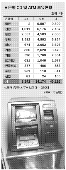 공정거래위원회가 현금지급기(ATM/CD) 이용수수료를 금융회사별 현금지급기 보유 대수에 따라 차등 적용할 수 있다고 판정했다. 현금지급기 수가 절대적으로 부족한 증권사에 은행이 이용수수료를 더 받아도 괜찮다고 공식적으로 인정해 준 셈이다. 결과적으로 앞으로 현금지급기 수수료는 회사별 기계 보유 숫자에 따라 차별화될 전망이다.●공정위 은행 손 들어줘
