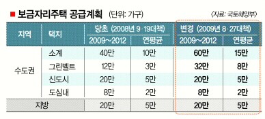 정부는 뛰는 집값을 잡고 서민들의 주거난을 해소하기 위해 2018년까지 그린벨트 해제지역에 짓기로 했던 30만가구의 보금자리주택을 이 대통령 임기 내인 2012년까지 모두 공급하기로 했다. 이에 따라 2018년까지 매년 3만가구씩 공급할 예정이던 수도권 보금자리주택은 2012년까지 매년 8만가구씩 쏟아져 나온다.