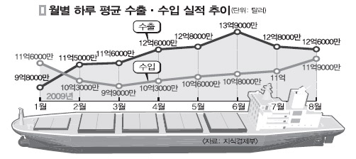 무역흑자의 감소 원인으로는 우선 수입이 크게 늘었다. 8월 하루 평균 수입액은 11억 9000만달러로 전달(11억달러)보다 8%가량 증가했다.