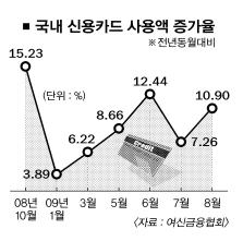 6월엔 정부의 노후차 세제 지원과 개별소비세 인하에 따른 일시적 효과라는 지적이 있었지만 8월 카드사용 증가율이 다시 두 자릿수로 높아졌다.