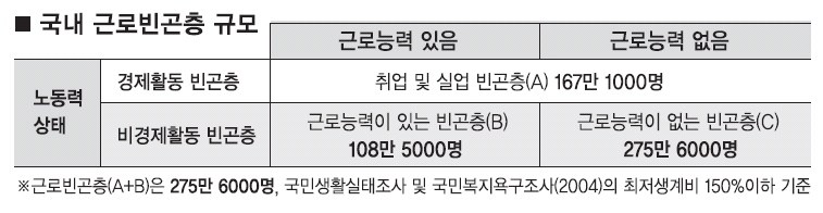 한국노동연구원은 6일 ‘근로빈곤 대책연구’ 보고서를 통해 기초생보를 중심으로 한 빈곤대책의 효과가 투입하는 재정규모에 비해 낮다면서 이렇게 주장했다. 이 연구는 노동부의 용역을 받아 수행한 것으로 앞으로 정부 정책에 반영될지 주목된다.