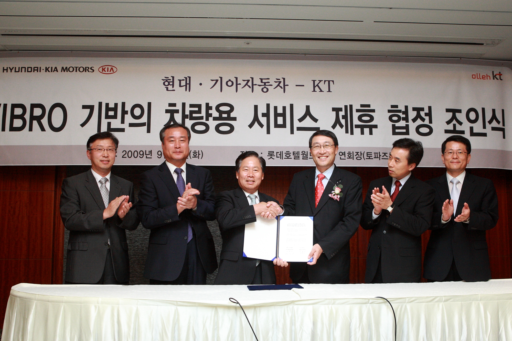 KT와 현대기아차는 8일 잠실 롯데월드호텔에서 석호익 KT 부회장과 이현순 현대기아차 연구개발담당 부회장 등 양사 임직원이 참석한 가운데 ‘WIBRO 기반의 차량용 서비스 제휴 협정 조인식’을 가졌다.