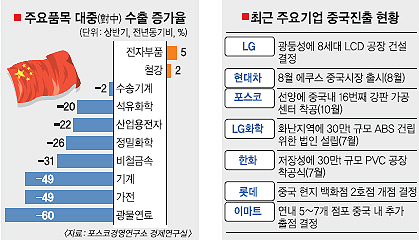 포스코도 올 1∼8월 철강제품 중국 수출이 지난해 같은 기간에 비해 34.4% 늘어난 195만 7000t을 기록했다. 올 들어 7월까지 현대·기아차의 중국 판매는 41만 351대로 지난해 같은 기간보다 55.1% 급증했다. 업계 관계자는 “일부 업종의 중국 실적 호조는 중국 정부의 내수 부양에 따른 부품 수출 증가와 현지 자회사 실적 개선 등에 힘입은 결과”로 분석했다.