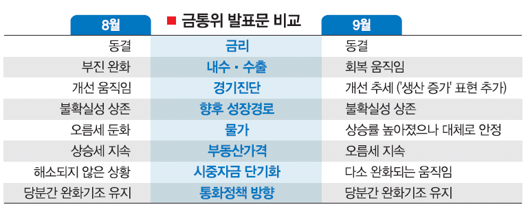이 총재가 금리 인상 신호를 높인 저변에는 나아진 경기 인식이 깔려 있다. 금통위는 지난달의 ‘경기 개선 움직임’이라는 표현을 이달에는 ‘경기 개선 추세’로 바꿨다. 반짝 개선이 아닌 추세적 개선으로 선언한 것이다. 7월 제조업 생산이 전기 대비에 이어 전년 동기 대비로도 플러스(0.8%)로 돌아선 점 역시 오는 11~12월 금리인상설에 힘을 실어준다. 하지만 한은은 “성장경로의 불확실성이 상존하고 있다.”는 단서를 여전히 달아놓음으로써 성급한 예단을 경계했다.