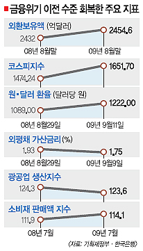 반면 금융시장은 완전히 정상을 되찾았다는 평가다. 정부와 한은이 공급한 565억달러의 유동성 가운데 대부분이 회수됐다. 지난해 10월 말 6.99%포인트까지 치솟았던 외국환평형기금채권(외평채·만기 5년)의 신용부도스와프(CDS) 프리미엄은 1.2~1.3%포인트 수준으로 떨어졌다. 외평채 가산금리도 지난해 10월31일 542bp(5.42%)까지 치솟았으나 지난 9일에는 175bp(1.75%)로 떨어져 금융위기 이전 수준을 회복했다.
