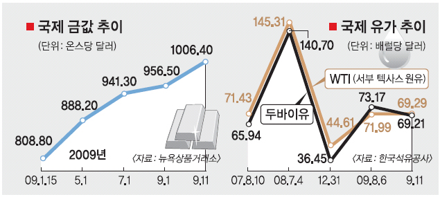 14일 한국석유공사 등에 따르면 지난 11일(현지시간) 뉴욕상품거래소(Comex)에서 금 12월물 선물 가격은 10일에 비해 9.60달러 오른 온스당 1006.40달러로 거래를 마쳤다. 금 선물 종가가 1000달러를 웃돈 것은 지난 2월 이후 처음이다.