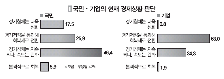기업 63%는 현재의 경제상황과 관련해 ‘경기가 저점을 지나 회복세로 전환하고 있다.’고 답했다. 반면 국민 46.4%는 ‘경기침체가 지속하면서 침체 속도가 완화되고 있다.’고 진단했다.