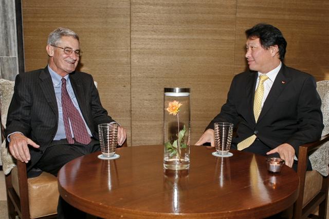 “한국경제의 미래는 교육과 기술에 달렸다.”최태원(오른쪽) SK그룹 회장과 노벨경제학상 수상자인 로버트 루커스(왼쪽) 미국 시카고대 경제학과 교수가 15일 저녁 서울 광장동 W호텔에서 ‘한국경제의 미래’를 놓고 속 깊은 대화를 나눈 뒤 내린 결론이다.