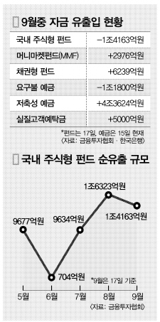 이런 추세라면 9월 한달간 국내 주식형 펀드 순유출 규모는 2조원을 크게 웃돌 것으로 예상된다. 앞서 코스피지수가 1400대로 치솟았던 지난 5월 9677억원이 순유출된 뒤 6월에는 704억원으로 줄었으나, 7월 9634억원, 8월 1조 6323억원 등으로 다시 급증세를 타고 있다.